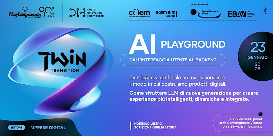 AI Playground si svolge venerdì 23 gennaio 2026 presso il Centro Congressi Confartigianato Vicenza, a Vicenza. Per iscrizioni, dettagli e aggiornamenti ufficiali, il riferimento è la pagina Eventbrite dell’evento.